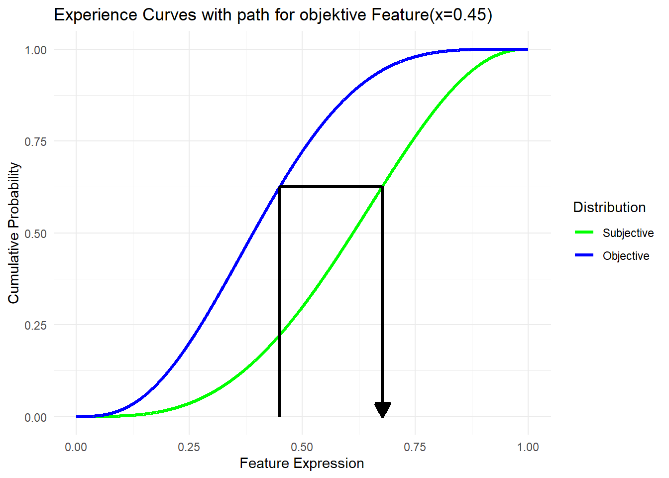 title = "Experience Curves with path for objektive Feature(x=0.45)",