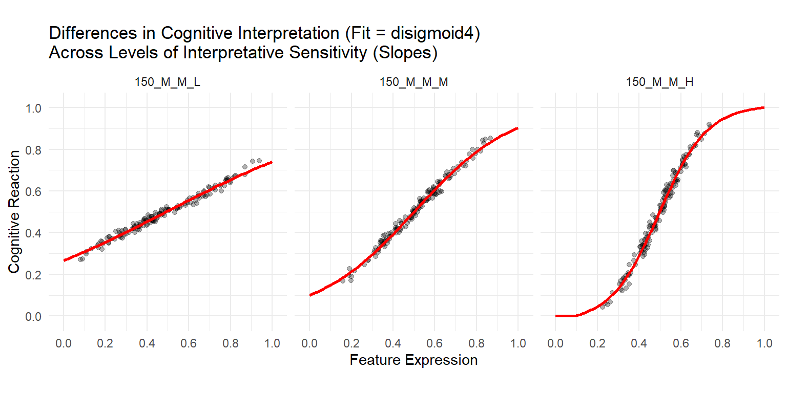 ids<-c("150_L_H_M", "150_M_H_M", "150_H_H_M","150_L_M_M", "150_M_M_M", "150_H_M_M","150_L_L_M", "150_M_L_M", "150_H_L_M")plt_agents<-agents[agents$ID%in%ids,]plot_experiences(experiences, plt_agents, fun_name ="disigmoid4", title ="Differences in Cognitive Interpretation (Fit = disigmoid4)\nAcross Levels of Feature Expression and Cognitive Reaction", save ="dif_cog_int_fea_exp_cog_rea_dis4")