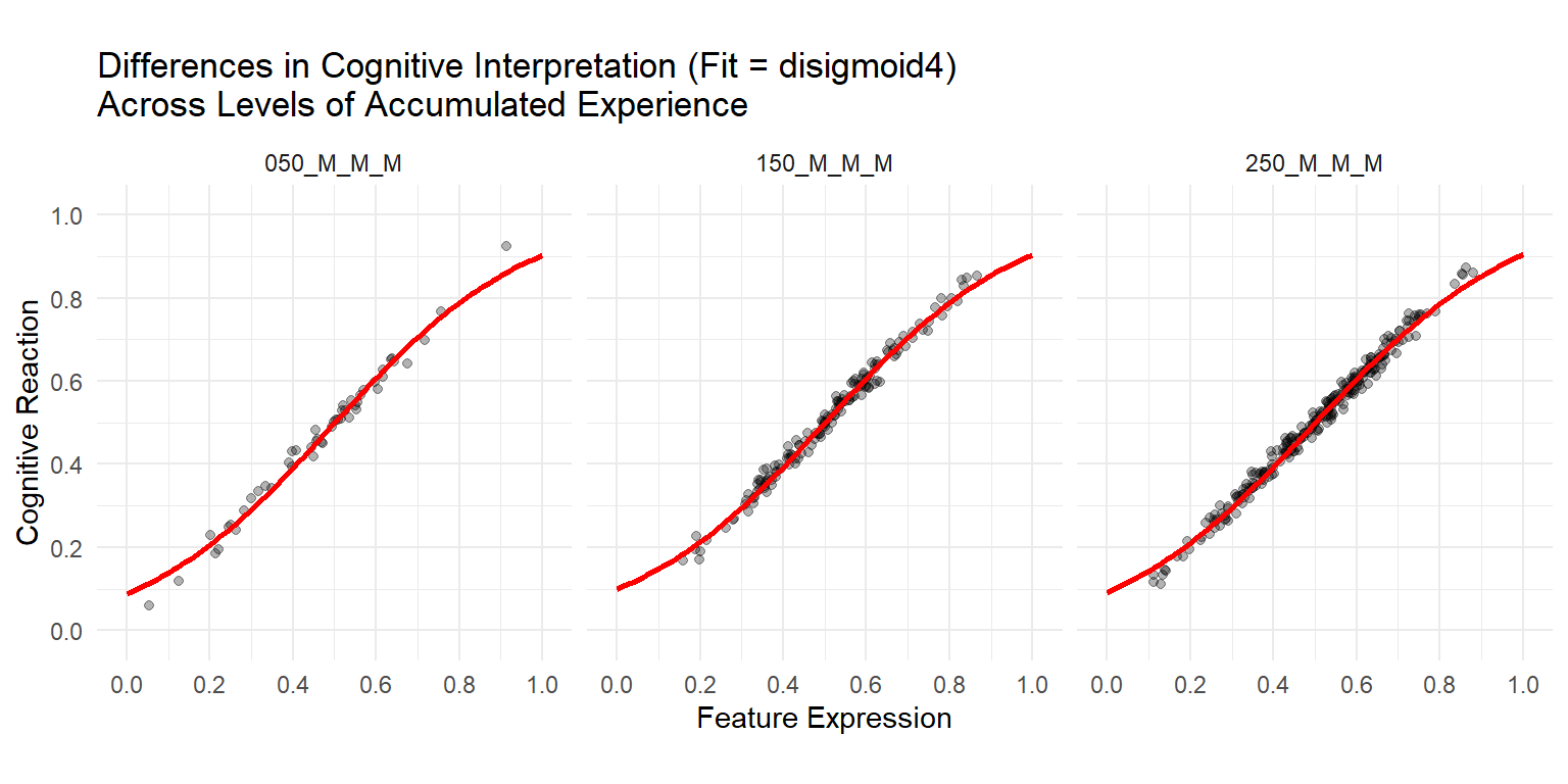 ids<-c("050_M_M_M", "150_M_M_M", "250_M_M_M")plt_agents<-agents[agents$ID%in%ids,]plot_experiences(experiences, plt_agents, fun_name ="disigmoid4", title ="Differences in Cognitive Interpretation (Fit = disigmoid4)\nAcross Levels of Accumulated Experience", save ="dif_cog_int_nexp_dis4")