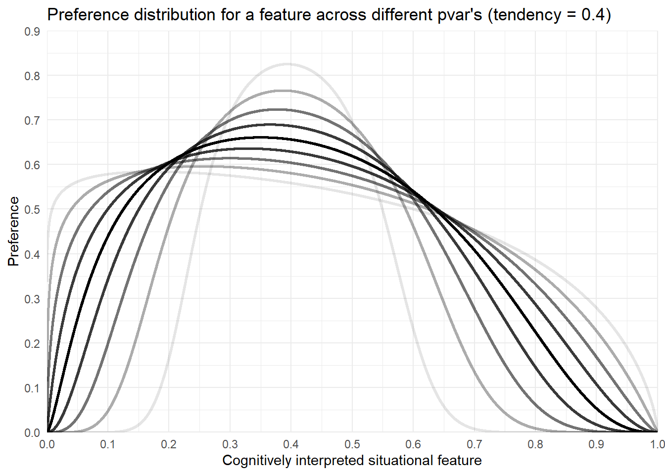 title ="Preference distribution for a feature across different pvar's (tendency = 0.4)")