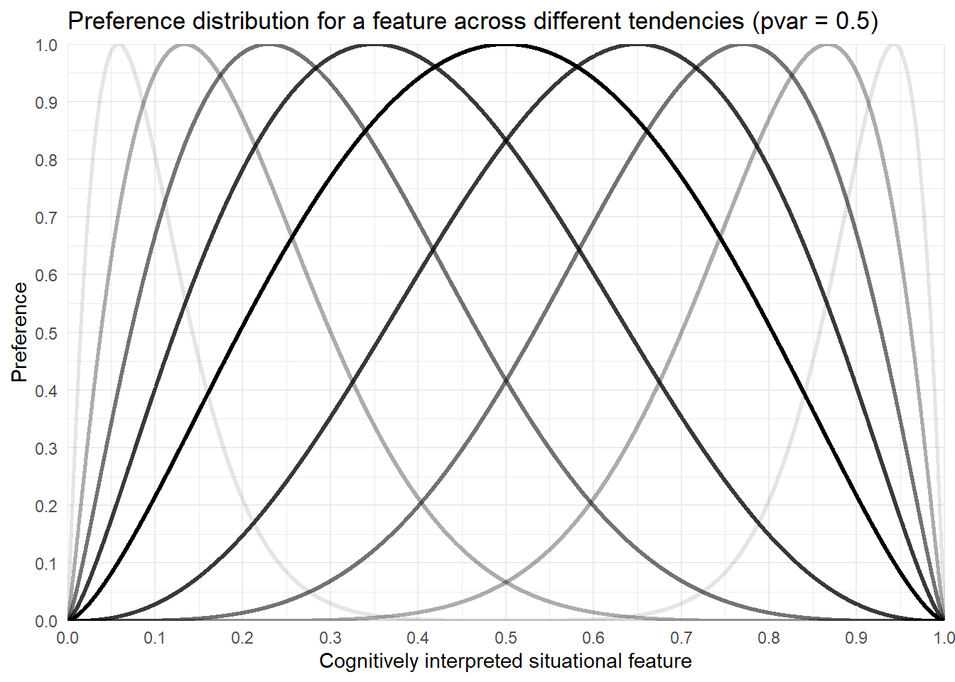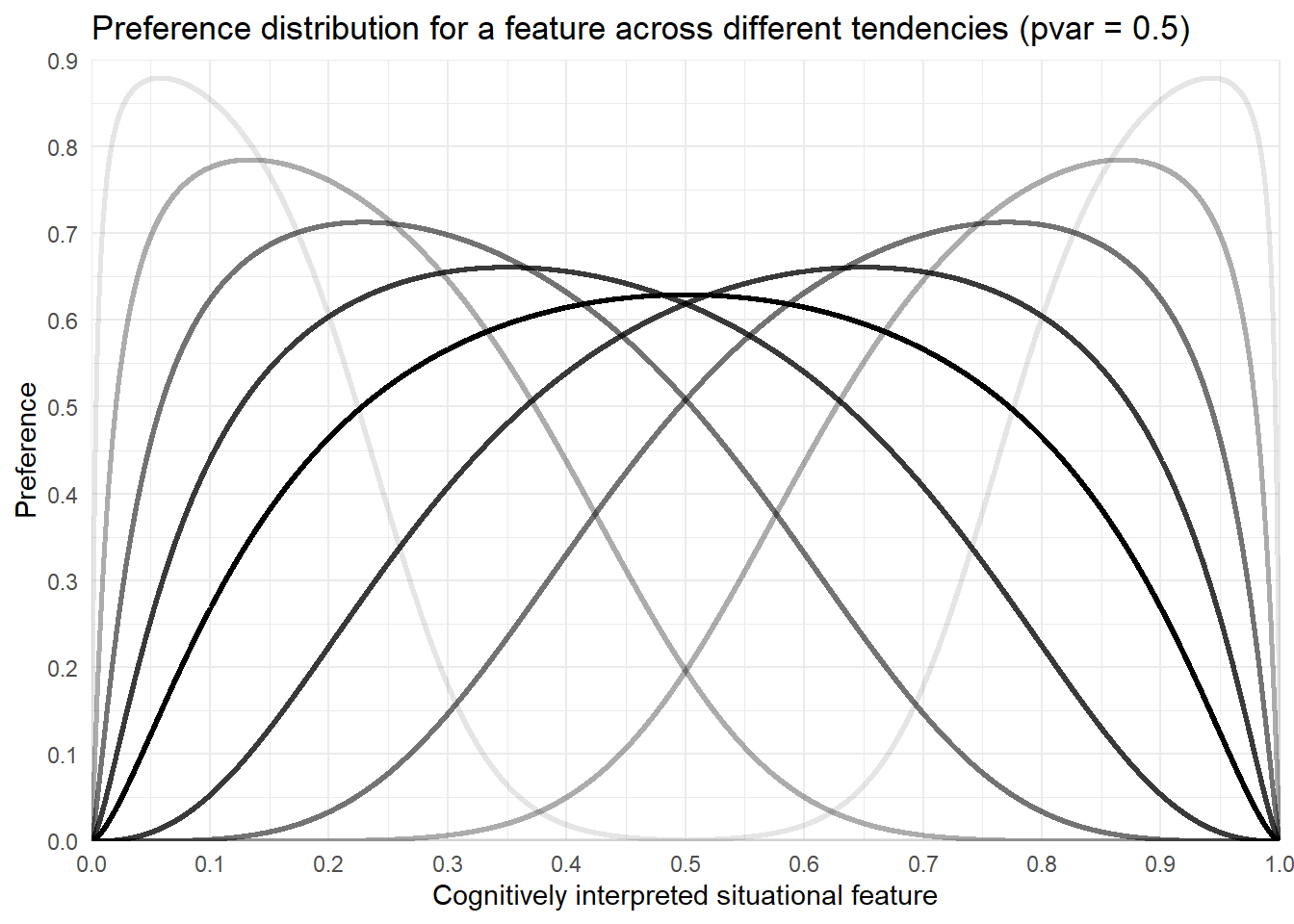 title ="Preference distribution for a feature across different tendencies (pvar = 0.5)")
